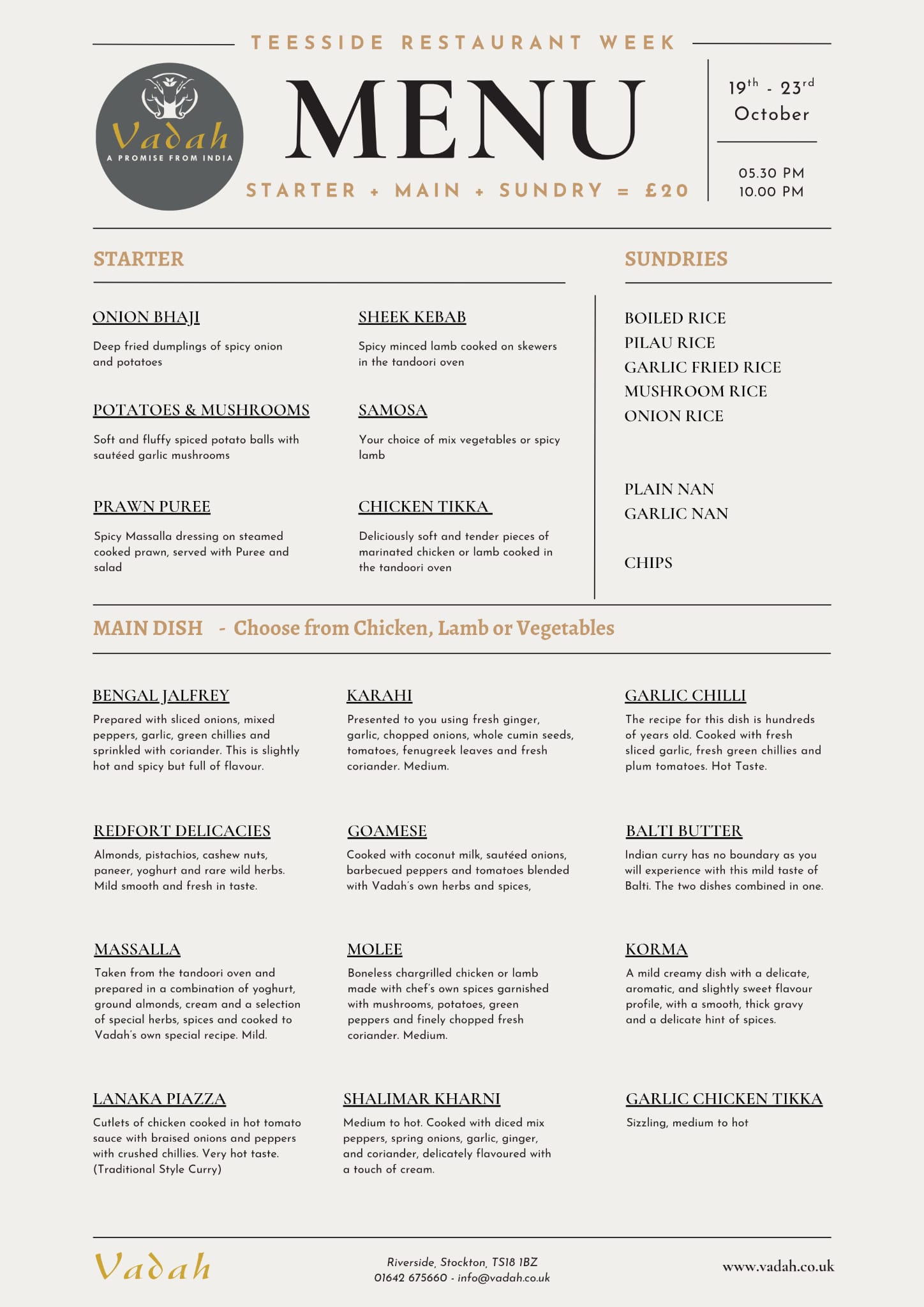 Vadah Restaurant situated by the Riverside in Stockton re-creates traditional Indian cooking with a twenty-first century twist. Vadah serves authentic Indian food, brilliantly presented, with breath-taking Riverside views. Award winning Chef Kaysar Ahmed conjures up innovative delights and elevates Indian cuisine to a fine dining level.